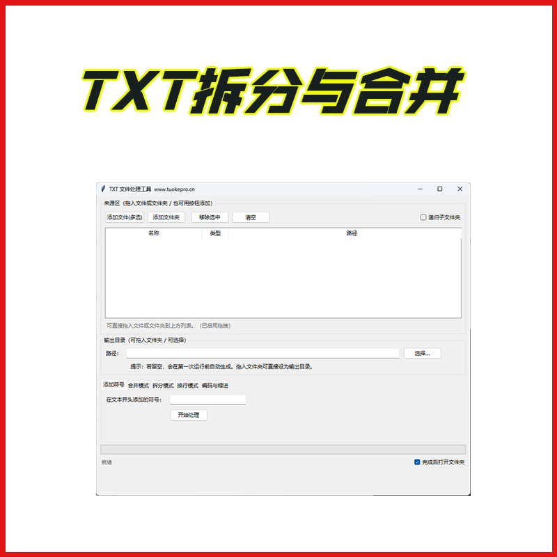 关键词:TXT合并,TXT拆分,按符号拆分,标点拆分,按行数拆分,按字数拆分,文本批量处理,分隔符不保留,无空行残留,目录级处理,文案整合,小说分章,字幕准备