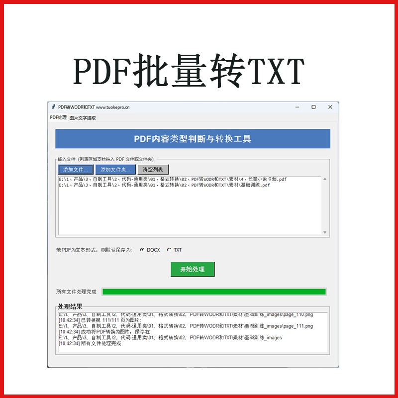 步骤3:开始转换;图片型PDF会导出为图片到新建文件夹,随后用“图片文字提取(OCR)”生成TXT。